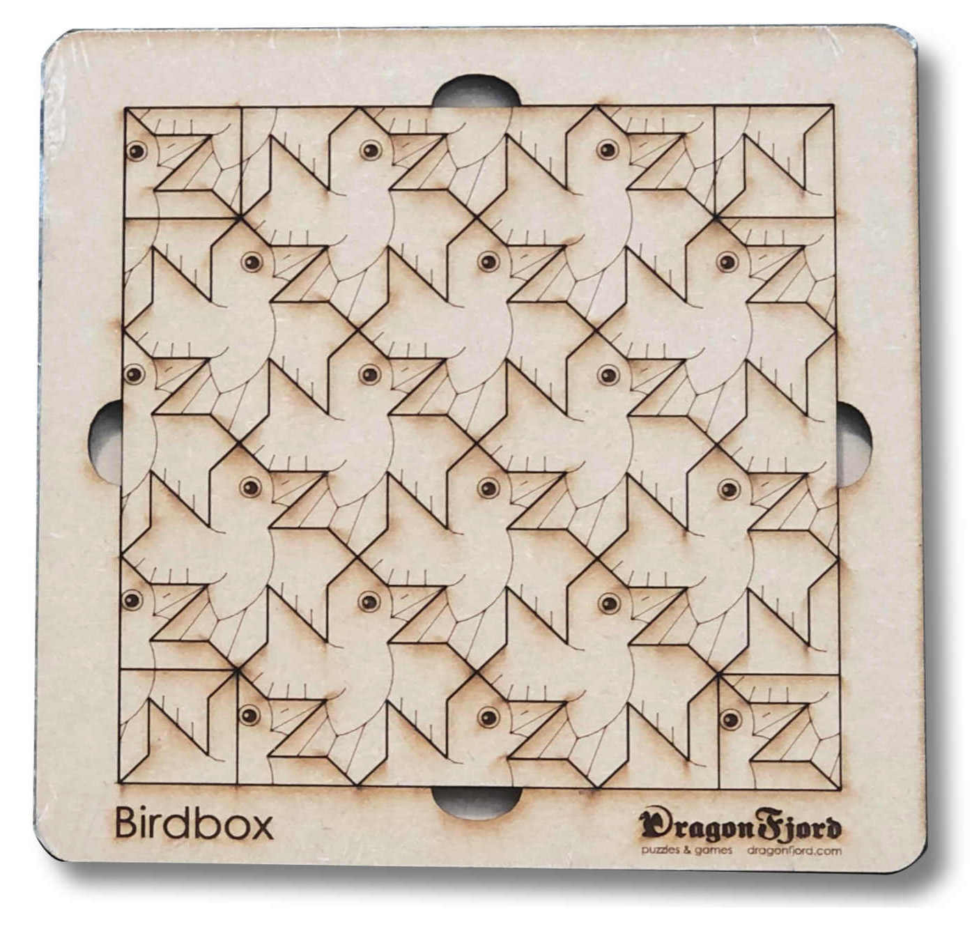 Based on a design by David Bailey of England, Birdbox features 24 birds as whole animals, halves and quarters. The whole birds are the same on all sides so you can explore symmetrical ways to place them together, and the pieces fit together in satisfying ways as you try to solve the 9 puzzles inside the frame.