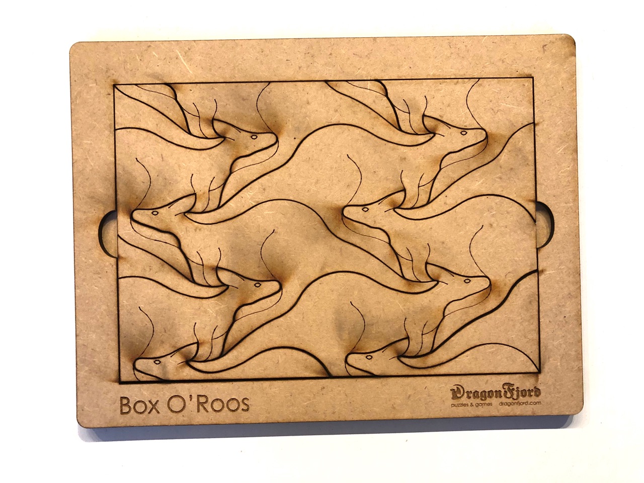Based on the artwork of Bruce Bilney from Australia. This 15 piece puzzle can be put together to make one rectangle, 8 whole kangaroos, or combinations of kangaroos and rectangles. It feels magical to see kangaroos turn into boxes and back again!